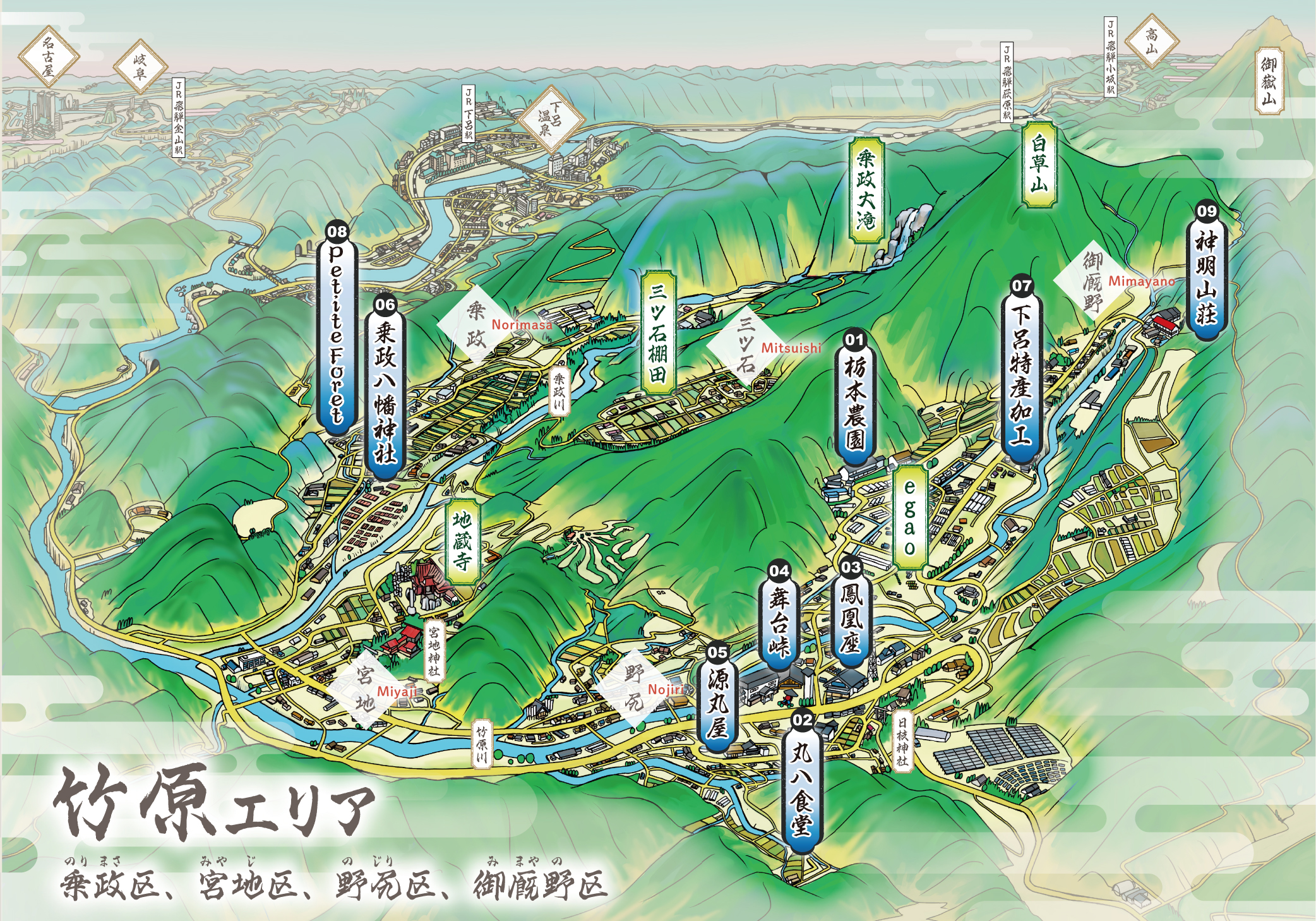下呂温泉から車で約20分。下呂の東の玄関口として知られる「竹原エリア」は、自然と暮らしが調和した豊かな里山です。岐阜県名水50選に選ばれた「乗政大滝」や、今もなお地域住民によって受け継がれている「地歌舞伎」(岐阜県の重要有形民俗文化財にも指定)があります。農業が盛んな地域ならではのフルーツトマト狩り体験や郷土料理「けいちゃん」、こだわりのカフェなどなど、美しい田園風景が広がる下呂市竹原地域でゆっくり、のんびりと過ごす楽しみ方を紹介しています。